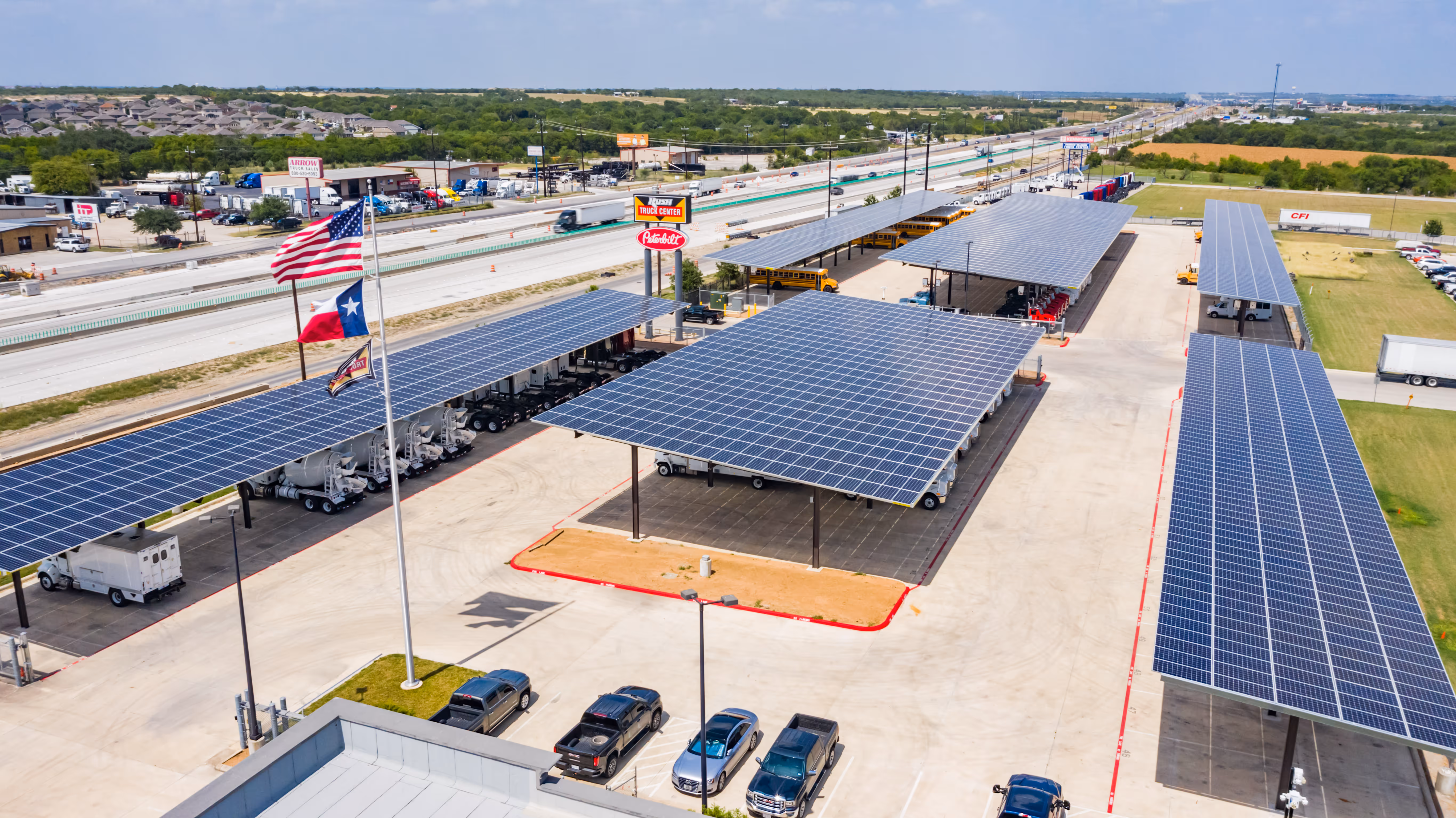 Rush Enterprises partnered with the Big Sun Community Solar program to offer solar carports at their trucking center in Converse, Texas. With 3,500 solar panels, this is the largest solar carport installation in Texas and provides shade to 181 semi trucks and powers approximately 125 homes.